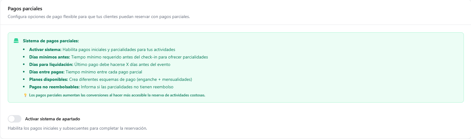 Para activar pagos parciales en una actividad, entra al panel, edita la actividad y busca la sección “Pagos parciales”.