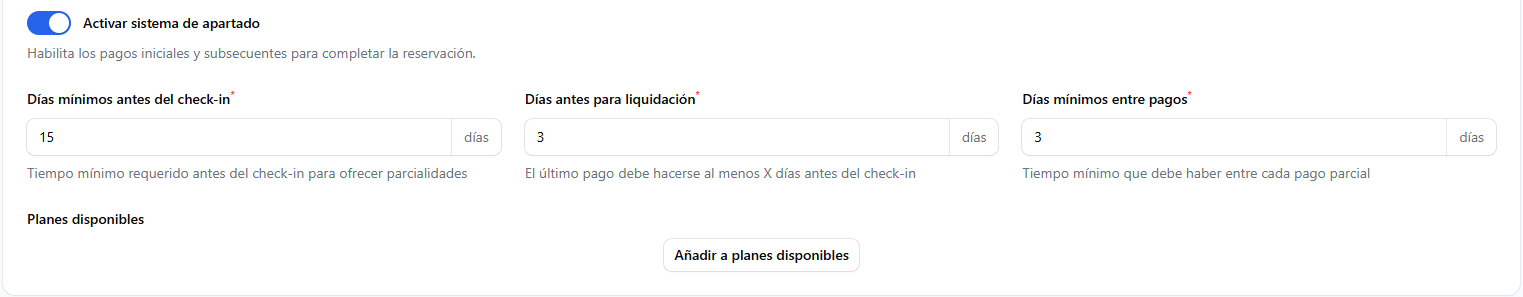 Luego, en “Planes disponibles”, agrega uno o varios planes como “50/50” o “3 pagos flexibles” para que el cliente los vea al reservar.
